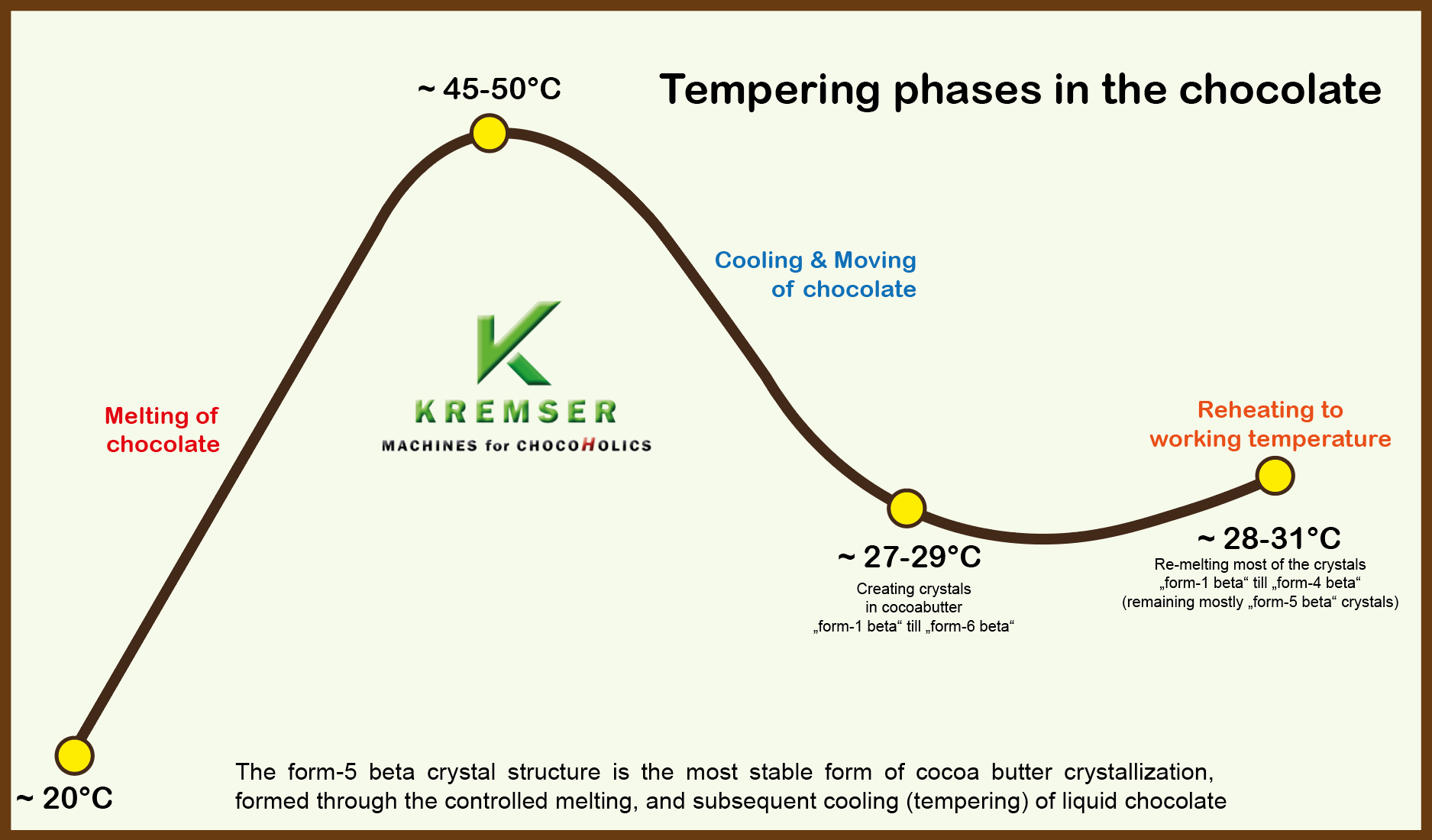 Das Aufschmelzen der Masse auf 45°C bewirkt, dass alle in der Kakaobutter befindlichen Kristalle aufgelöst werden. Diese werden dann durch Kühlen und Bewegung neu erzeugt. Bei Wasser gibt es eine Kristallform, wo man weiß, dass sie bei 0°C zu Eis wird. Die Kakaobutter kann verschiedene Kristallformen erzeugen, genannt Beta-1 Kristall bis hin zu Beta-6 Kristallen, wobei die Beta-5 Kristalle die beste Struktur aufweist, um der Schokolade später die schnelle Abkühlung / Aushärtung zu ermöglichen genauso wie Glanz, Haltbarkeit und knackigem Bruch. Die Kristalle haben unterschiedliche Schmelzpunkte. Eine Schokolade, wie sie bei der 2-Stufen-Temperierung erreicht wird, ist bereits gut und ausreichend. Es befinden sich halt nur etwas mehr Beta-2 bis Beta-4 Kristalle in der Masse. Um diese gute Schokoladenmasse noch besser zu machen, hat FBM die kontrollierte Nachwärmzone in den größeren Systemen integriert. So temperiert man die Masse ca. 1-2 Grad tiefer als die normale Verarbeitungstemperatur, um noch mehr Kristalle, bevorzugt Beta-5, zu kreieren. Mit dem Anwärmen der Masse werden dann einige der "schlechteren" Kristallformen wieder aufgelöst. So erhält man eine qualitativ bessere Schokoladenmasse.