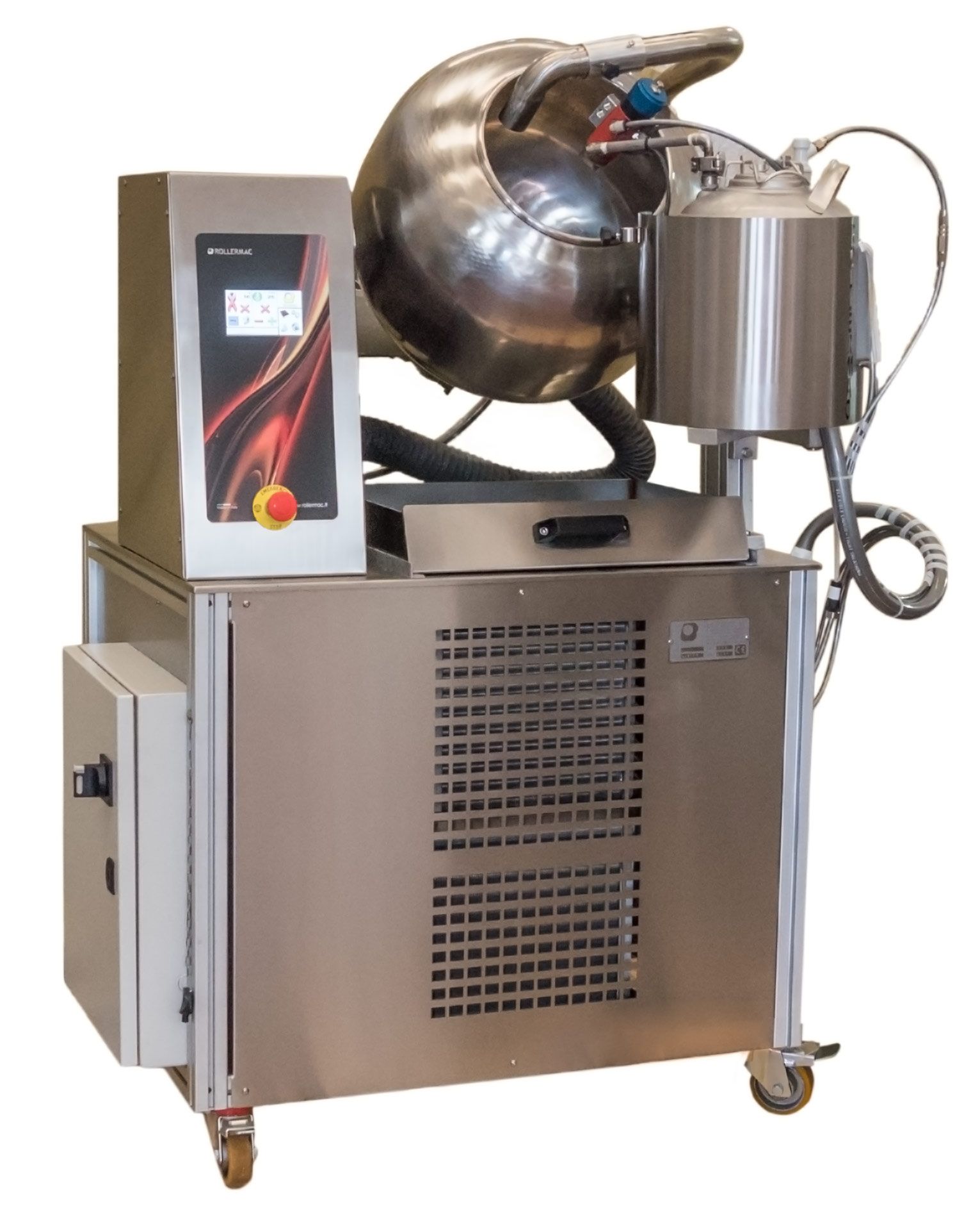Die ROLLERCHOCO SPRAY Reihe ist eine ""All-in-One-Lösung" für Ihren mobilen Einsatzort und ist geeignet zum Dragieren von Einlagen (Nüsse, Mandeln, Trockenfrüchte etc.) mit Schokolade oder einer Zuckerlösung. Alle Komponenten sind auf einem Rahmen montiert und fahrbar gestaltet; somit entscheiden Sie selbst über den Einsatzort. Lediglich Strom und Druckluft muss vorhanden sein. Die RCS Serie gibt es mit Kesselgrößen 15 kg und 25 kg, wobei die RCS-15 PLUS SPRAY auch mit der neuen Schnellwechselfunktion ausgestattet ist. So können Sie z.B. für Versuchszwecke einen optionalen 1,5 kg Kessel aufsetzen oder für Kleinstchargen einen 7-8 kg Kessel. Oder Sie wechseln den Kessel mit dergleichen Größe und nutzen einen zum Dragieren und einen separaten zum Glänzen. So entfällt die Reinigung beim Wechsel. Clever! Der Druckbehälter mit Sprühvorrichtung ist patentiert und hier in Größe 7lt gleich an der Maschine angebaut (schwenkbar). Er ist einfach zu reinigen und für Schokolade oder Zuckerlösung geeignet. Die speziell für Dragiermaschinen konzipierte Rollermac-Steuerung wird Ihnen Ihr "Dragierleben" vereinfachen. je nach Produkterfordernis kann mit Raumluft, Warmluft, Kaltluft oder getrockneter Luft gearbeitet werden. Die Temperatur kann man bis zu ca. 80-90°einstellen, falls einmal Ihre Zuckerlösung eine solch hohe Temperatur benötigt.