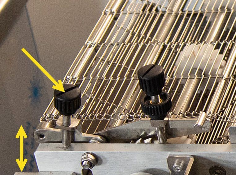 Bei Gami kann man den Gitterband-Auslauf in der Höhe verstellen. Dies ist z.B. sinnvoll bei Kugeln, damit diese besser auf das Papier "fallen" und sich nicht so oft in der Entschwänzerwelle "einrollen". Man hat auch für andere Produkte eine bessere Möglichkeit, einen optimalen Übergang Ihrer Produkte einzustellen. Ein weiterer positiver Nebeneffekt ist, dass man den Auslauf auch umklappen kann, Somit wird das Gitterband entspannt, hält länger und kann nicht so schnell mit den Antriebsrädern beim erhärten "verkleben".